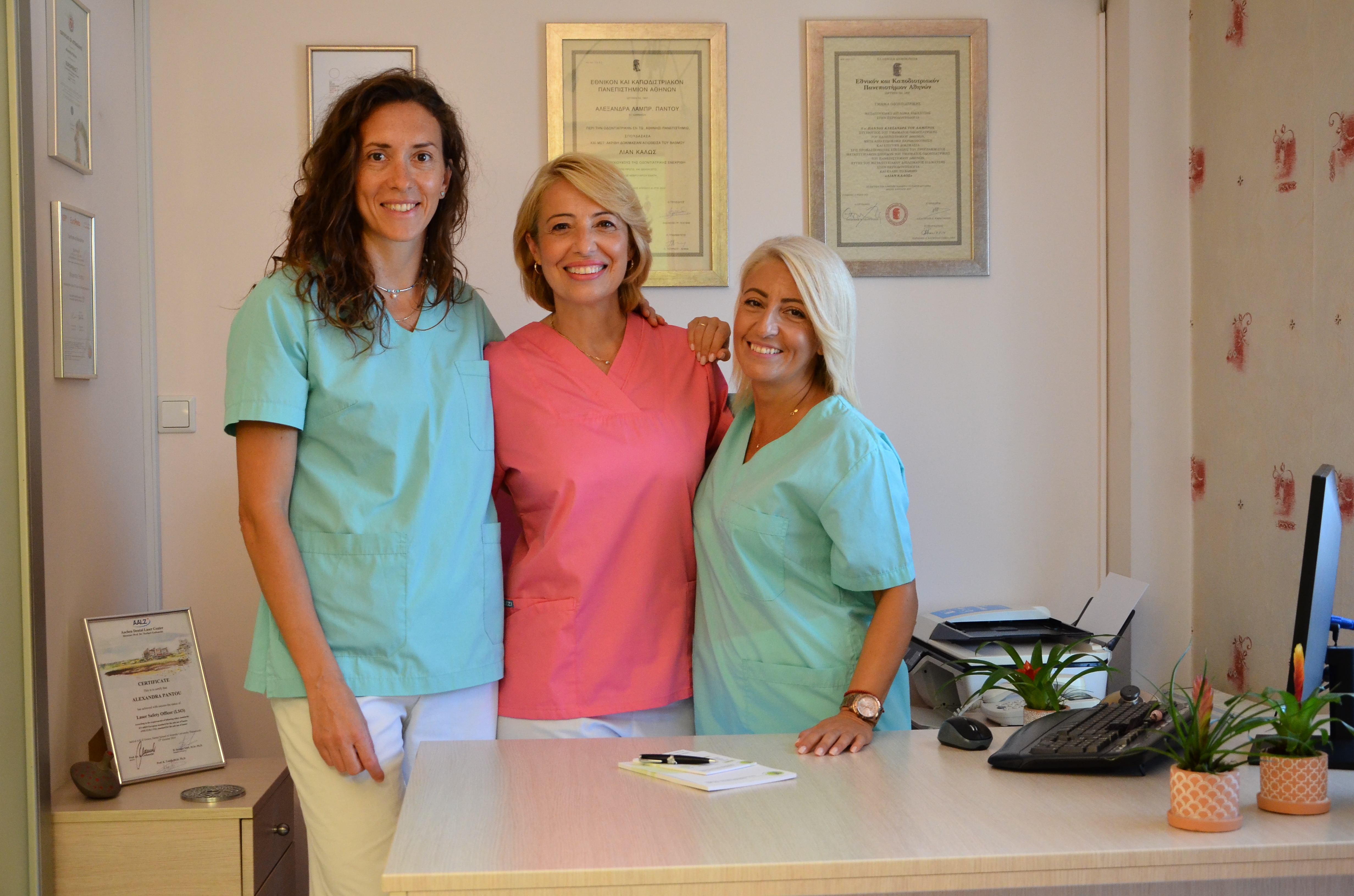 Η ομάδα μας, που σαν κύριο μέλημα έχει την παροχή υψηλής ποιότητας οδοντιατρικών υπηρεσιών έχοντας απόλυτη προτεραιότητα την ασφάλεια και την άνεση των ασθενών μας, απαρτίζεται από τη γιατρό μας, την κυρία Αλεξάνδρα Πάντου (Περιοδοντολόγος-Εμφυτευματολόγος), καθώς και τις δυο υπέροχες κυρίες που την πλαισιώνουν: Όλγα Βάρδη και Ροζίτα-Μαρία Βακάρου (Βοηθοί Οδοντιάτρου & Dental Hygienists-Υγιεινολόγοι).